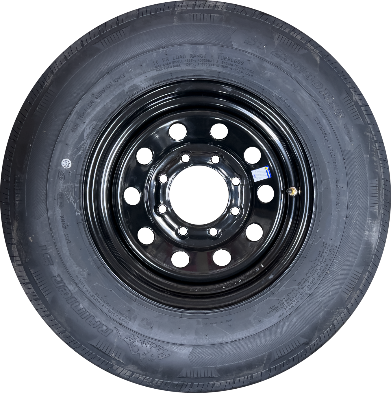Black Mod Steel Wheel 8x6.5 Bolt Pattern 235x80x16 Radial Tire 10 Ply Load Range E 3520lbs @ 80psi